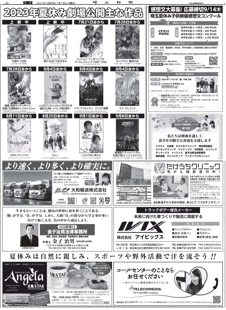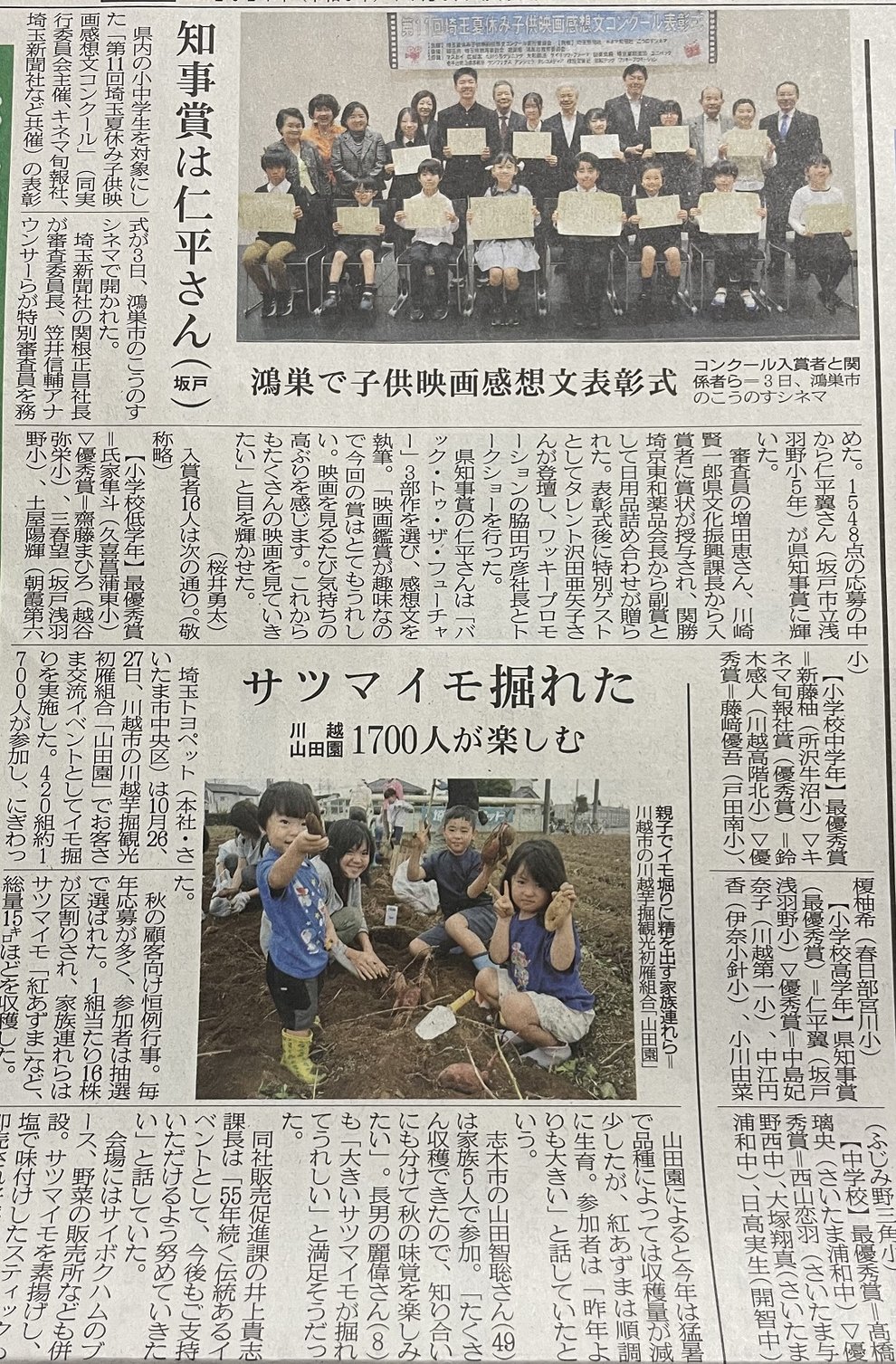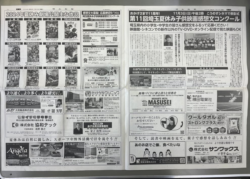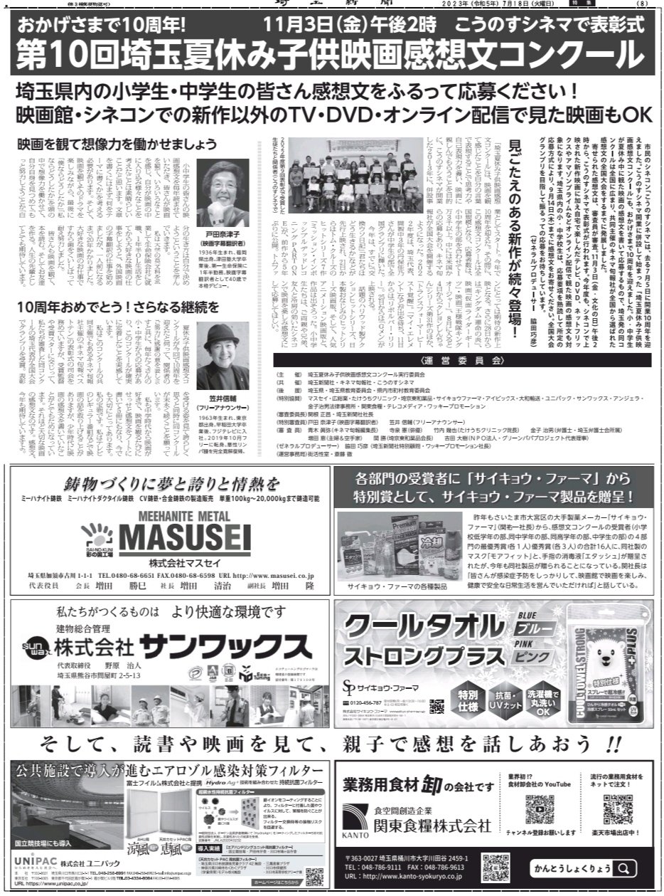 第11回目迎えた「埼玉夏休み子供映画感想文コンクール」の応募見開き2ページ特集記事が、埼玉新聞で特集されました。