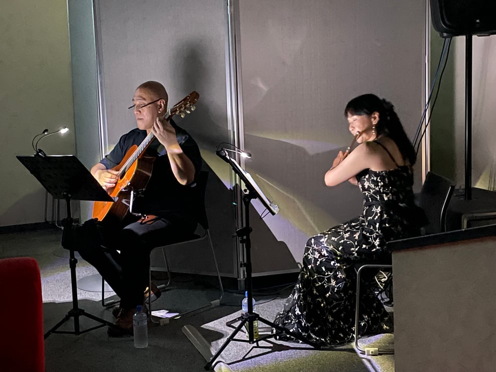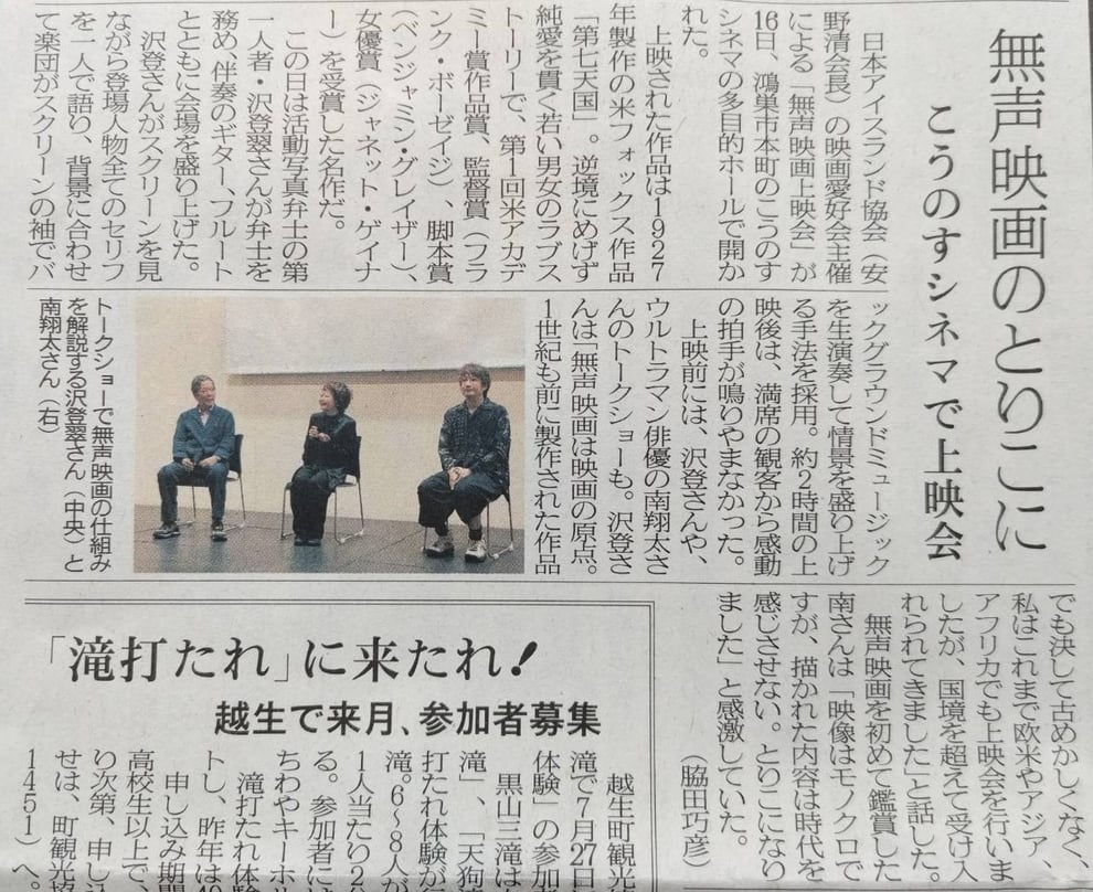 今回の無声映画では、活動写真弁士の第一人者・澤登翠(さわとみどり)さんがスクリーンに映し出される映像を見ながら、登場人物の全セリフを一人で喋り、画面に合わせてギターとフルートがバックグラウンドミュージックを演奏し、臨場感を盛り上げる手法で観客を魅了しました。