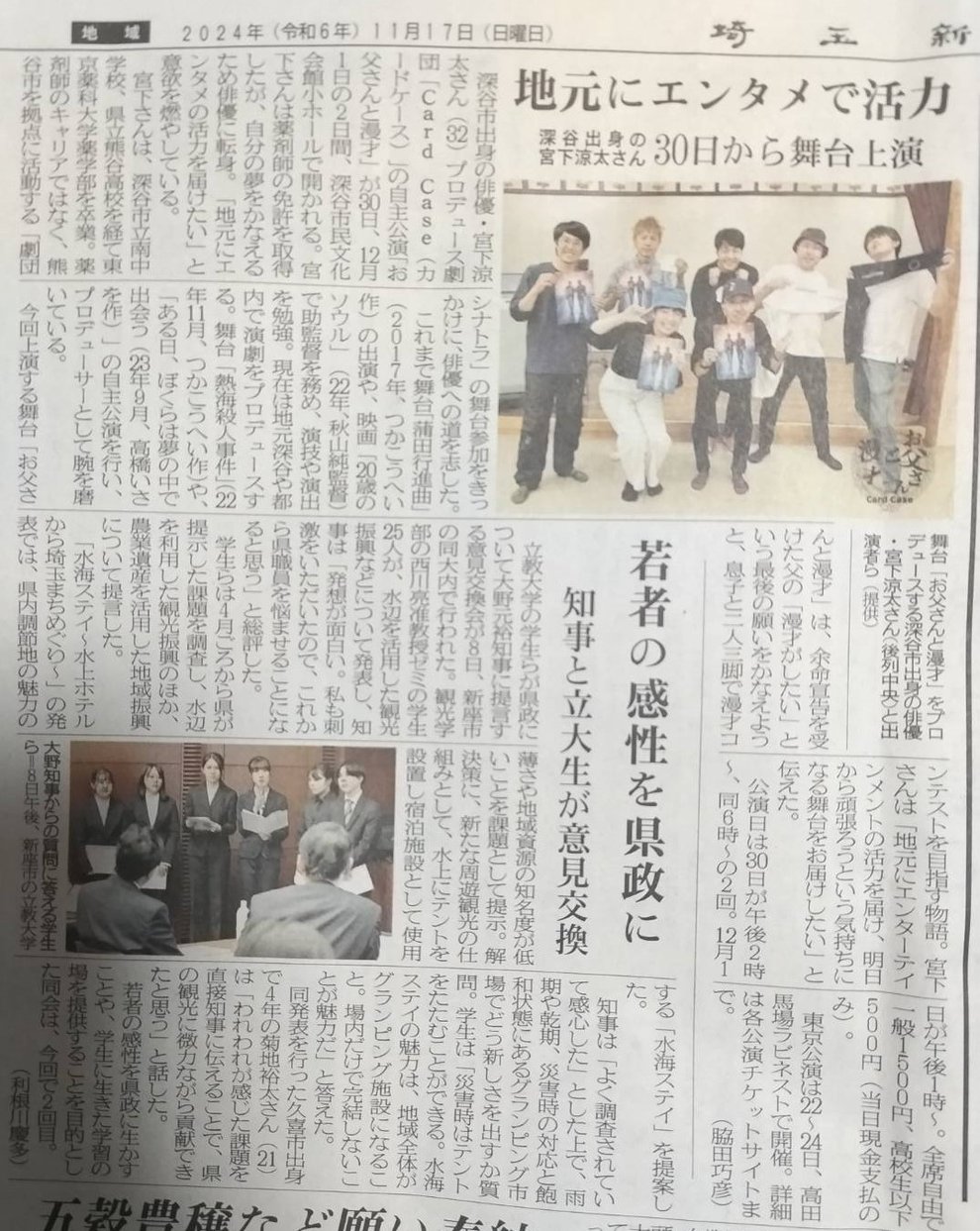 「お父さんと漫才」を埼玉新聞で記事にしました。グループのメンバーが頑張っていることを応援しています。